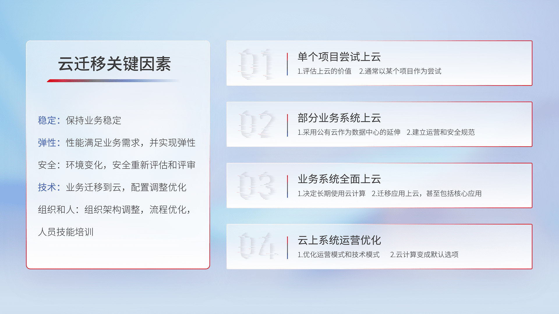 结合实际业务,,从规划设计、、、云平台选型、、云原生改造、、、数据迁移、、、集成交付,,,,迁移全过程为客户识别最佳上云路径,,做好风险识别管理,,设计网络架构、、、身份权限、、、、安全审计合规、、操作审计、、、、日志审计、、、、监控告警策略、、多站点容灾设计等,,,,对云上基础设施进行整体规划,,,提升IT治理水平,,以满足弹性、、高可用、、高性能的需求。。